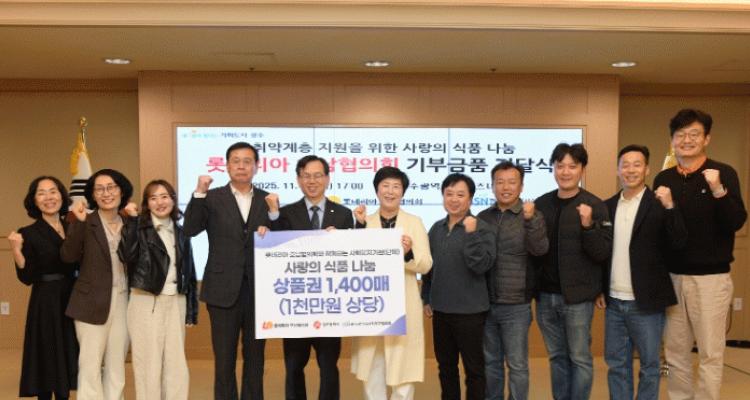 ±¤ÁÖ±¤¿ª½Ã´Â 27ÀÏ ½Ãû ºñÁî´Ï½º½Ç¿¡¼ ·Ôµ¥¸®¾Æ È£³²ÇùÀÇȸ, ±¤ÁÖ»çȸº¹ÁöÇùÀÇȸ¿Í ÇÔ²² ¡®±âºÎ¹°Ç° Àü´Þ½Ä¡¯À» °¡Á³´Ù. ·Ôµ¥¸®¾Æ È£³²ÇùÀÇȸ´Â À̳¯ 1¸¸¿ø »ó´ç »óǰ±Ç 1400¸Å¸¦ ±âºÎÇßÀ¸¸ç, »çȸº¹ÁöÇùÀÇȸ´Â À̸¦ Áö¿ª ¿ä¾ç¿ø ¾î¸£½Å°ú Áö¿ª¾Æµ¿¼¾ÅÍ ¾Æµ¿ µî¿¡°Ô Àü´ÞÇÒ ¿¹Á¤¡¦