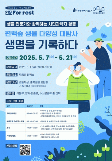 ¡¯Æí¹é½£ »ý¹° ´Ù¾ç¼º ´ëŽ»ç¡®´Â »ý¹° Àü¹®°¡¿Í ½Ã¹ÎµéÀÌ ÇÔ²² ¹«µî»êÀÇ »ý¹°Á¾À» ã¾Æ ³ª¼´Â ½Ã¹Î °úÇÐÀÚ È°µ¿À¸·Î, ±¤ÁÖÀü³²³ì»ö¿¬ÇÕÀÌ ÁÖ°üÇÏ¿© ±è¿¬°æ ÄÚ¸®¾Æ»ýÅ¿¬±¸¼Ò ¿¬±¸¿ø, ¹Ú°æÈñ Àü³²´ëÇб³ ¿¬±¸¿ø µîÀÇ Àü¹®°¡°¡ Âü¿©ÇÑ´Ù. ÃʵîÇлý°ú ÁßÇлýÀ» Æ÷ÇÔÇÑ °¡Á·À» ´ë»óÀ¸·Î ÃÑ 30¸íÀ» ¸ðÁýÇÑ´Ù.
