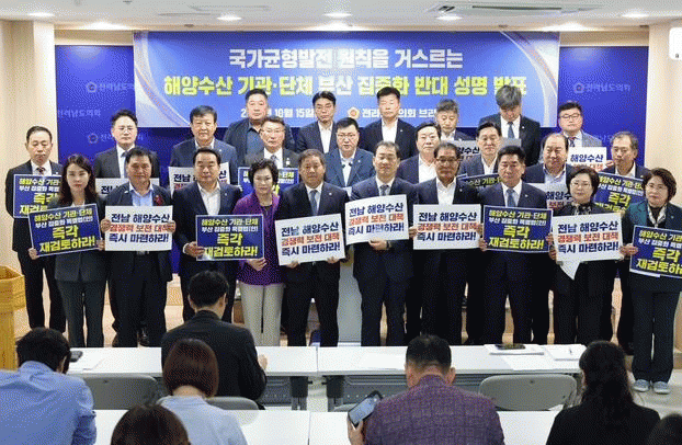 ÃÖ ÀÇ¿øÀº ³¡À¸·Î ¡°Á¤ºÎ¿Í ±¹È¸´Â ÇØ¾ç¼ö»ê ±â°ü°ú ±â¾÷ÀÇ ºÎ»ê ÀÌÀüÀ» Á¶ÀåÇÏ´Â ¹ý¾ÈÀ» Áï°¢ Àç°ËÅäÇϰí, Àü³² ÇØ¾ç¼ö»ê »ê¾÷ÀÇ Áö¼Ó°¡´É¼ºÀ» º¸ÀåÇÒ ´ëÃ¥À» ¸¶·ÃÇØ¾ß ÇÑ´Ù¡±°í °ÇÏ°Ô Ã˱¸Çß´Ù.