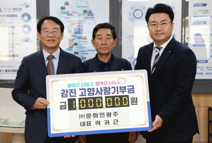 Á¤ÁøÅ ¾¾ÄÉÀ̰Ǽ³(ÁÖ) ȸÀå, ¸¶±¤¹® ¢ß´õ¿øºñÁî´Ï½ºÈ£ÅÚ ¹× °­Áø, ÀåÈï ¾á¸¶³ó±â°è ´ëÇ¥, °û±Í±Ù ¢ß¹®È­Àα¤ÁÖ ´ëÇ¥°¡ °­ÁøÀ» ÇâÇÑ »ç¶ûÀ» ´ã¾Æ °íÇâ»ç¶û±âºÎ±ÝÀ» ±âŹÇß´Ù.
