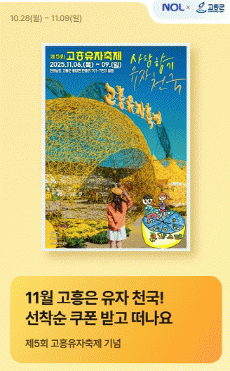 À̹ø ÇÁ·Î¸ð¼ÇÀº ¿©Çࡤ¿©°¡¡¤¹®È Ç÷§ÆûÀÎ NOL°úÀÇ Çù¾÷À¸·Î ÃßÁøµÇ¸ç ¡ãÄíÆù ¹ß±Þ ±â°£Àº 10¿ù 28ÀϺÎÅÍ 11¿ù 9ÀϱîÁö ¡ãÅõ¼÷ °¡´É ±â°£Àº 10¿ù 28ÀϺÎÅÍ 11¿ù 30ÀϱîÁö´Ù.