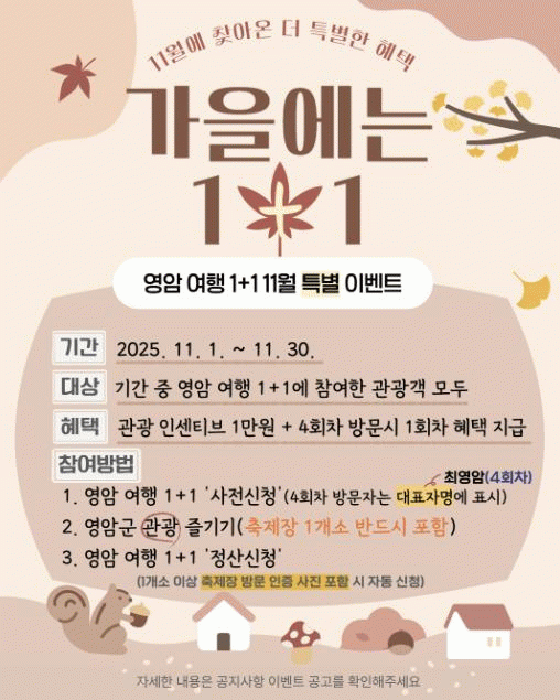 ¿µ¾Ï±ºÀÌ Áö¿ª ÃàÁ¦ °³ÃÖ¿Í ¿¬°èÇØ 11¿ù ÇÑ ´Þ ¡®¿µ¾Ï¿©Çà 1+1 Ưº°À̺¥Æ®¡¯·Î Áö¿ªÈÆó ¿ùÃâÆäÀ̸¦ 1¸¸¿ø Ãß°¡ Áö±ÞÇÑ´Ù.