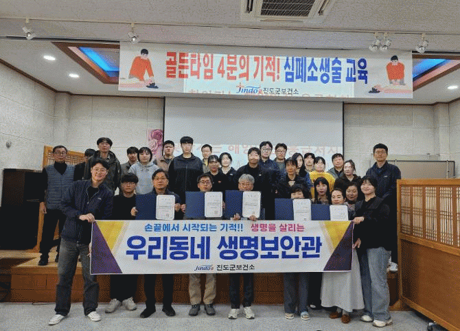 Áøµµ±ºÀº Áö³­ 10¿ù 29ÀÏ¿¡ Áøµµ±ºº¸°Ç¼Ò¿¡¼­ ÀÀ±ÞȯÀÚ ¹ß»ý ½Ã ½Å¼ÓÇÏ°Ô ´ëÀÀÇÒ ¼ö ÀÖµµ·Ï ½ÉÆó¼Ò»ý¼ú(CPR) ±³À°À» ÁøÇàÇϰí, ±³À° ¼ö·áÀÚ¸¦ ¡®¿ì¸®µ¿³× »ý¸íº¸¾È°ü¡¯À¸·Î À§ÃËÇß´Ù.
