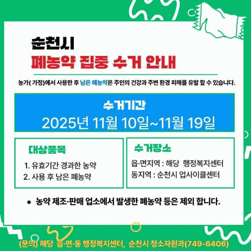 ¼øÃµ½Ã´Â ³ó°¡¿Í °¡Á¤¿¡¼­ »ç¿ë ÈÄ ³²Àº Æó³ó¾à°ú À¯È¿±â°£ÀÌ Áö³­ ³ó¾àÀ» ¾ÈÀüÇÏ°Ô ¼ö°ÅÇϱâ À§ÇØ Æó³ó¾à ÁýÁß¼ö°Å ±â°£À» ¿î¿µÇÑ´Ù°í ¹àÇû´Ù.