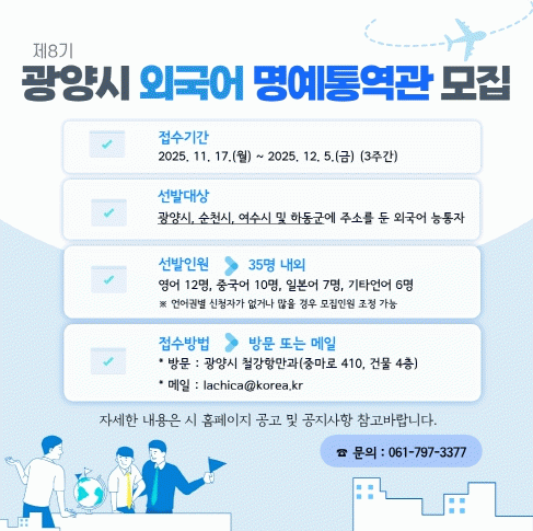 Á¦8±â ¸ðÁý ÀοøÀº ÃÑ 35¸í(¿µ¾î 12¸í, Áß±¹¾î 10¸í, ÀϺ»¾î 7¸í, ±âŸ ¾ð¾î 6¸í) ³»¿ÜÀ̸ç, Áö¿ø ÀÚ°ÝÀº ±¤¾ç½Ã¸¦ ºñ·ÔÇØ ¼øÃµ¡¤¿©¼ö¡¤Çϵ¿ µî Àα٠Áö¿ª °ÅÁÖÀÚ Áß ¿Ü±¹¾î ´ÉÅëÀÚ ¶Ç´Â Çѱ¹¾î°¡ ´É¼÷ÇÑ ¿Ü±¹ÀÎÀÌ´Ù. ¼±¹ßµÈ ¸í¿¹Å뿪°üÀº 2026³â 1¿ùºÎÅÍ 2027³â 12¿ù±îÁö 2³â°£ Ȱµ¿ÇÑ´Ù.
