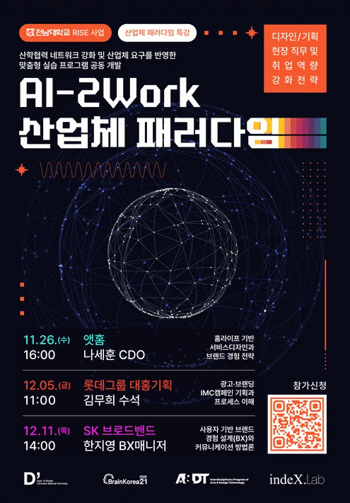¿À´Â 11¿ù 26ÀϺÎÅÍ ½ÃÀ۵Ǵ À̹ø ÇÁ·Î±×·¥Àº Àü³²´ëÇб³ µðÀÚÀÎÇаú°¡ ÁÖÃÖ¡¤ÁÖ°üÇÏ°í ¾ÆÆ®¡¤µðÀÚÀÎÅ×Å©³î·ÎÁö Çùµ¿°úÁ¤ÀÌ °øµ¿ÁÖ°üÇÑ´Ù.