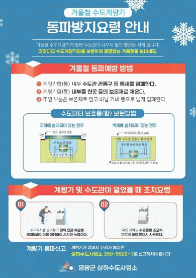 ¼öµµ°è·®±â ¹× ¼öµµ°ü µ¿ÆÄ¹æÁö¸¦ À§Çؼ´Â ¼öµµ°è·®±â º¸È£Åë ³»ºÎ¿¡ Çå¿Ê µî º¸¿ÂÀ縦 ³Ö¾î Âù °ø±â À¯ÀÔÀ» ¸·À» ¼ö ÀÖµµ·Ï º¸¿Â Á¶Ä¡¸¦ Çϰí, Àå±â ¿ÜÃ⠽ÿ¡´Â ¼öµµ²ÀÁö¸¦ Á¶±Ý Ʋ¾î ¹°À» Èê·Áº¸³»¸é µ¿ÆÄ¿Í ¼öµµ°ü °áºùÀ» ¿¹¹æÇÒ ¼ö ÀÖ´Ù.
