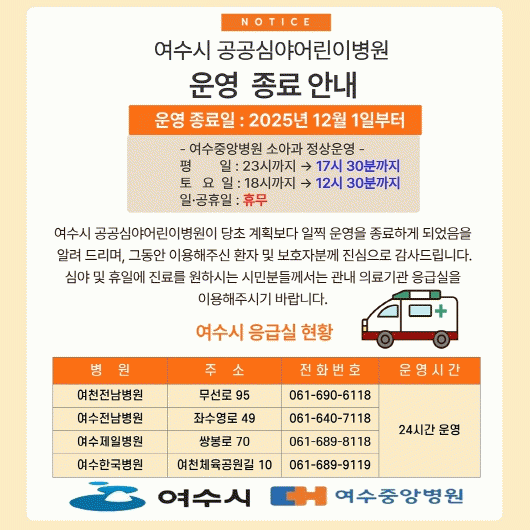 ½Ã °ü°èÀÚ´Â ¡°¿©¼ö½Ã °ø°ø½É¾ß¾î¸°À̺´¿øÀº Áö¿ª ºÎ¸ðµéÀÌ °¡Àå ÇÊ¿ä·Î ÇÏ´Â Çʼö ÀÇ·á ¼ºñ½º Áß Çϳª¿´´Ù¡±¸ç ¡°À̹ø Á¶±â Á¾·á´Â º´¿øÀÇ ¿äûÀ¸·Î ºÒ°¡ÇÇÇÏ°Ô °áÁ¤µÈ »óȲÀÎ ¸¸Å 2026³â¿¡´Â º¸´Ù ¾ÈÁ¤µÈ ü°è·Î ÀçÁ¤ºñÇØ ¿î¿µÀÌ Àç°³µÉ ¼ö ÀÖµµ·Ï ³ë·ÂÇϰڴ١±°í ¹àÇû´Ù.
