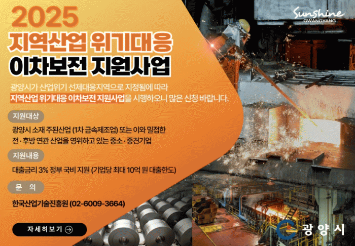 Áö¿ø ´ë»óÀº ±¤¾ç½Ã ¼ÒÀç 1Â÷ ±Ý¼ÓÁ¦Á¶¾÷(C24) ±â¾÷ ¹× ÀÌ¿Í ¹ÐÁ¢ÇÑ Àü¡¤ÈÄ¹æ ¿¬°ü »ê¾÷À» ¿µÀ§ÇÏ´Â Áß¼Ò¡¤Áß°ß±â¾÷À̸ç, ´ëÃâÇѵµ´Â ±â¾÷´ç ÃÖ´ë 10¾ï ¿øÀÌ´Ù.