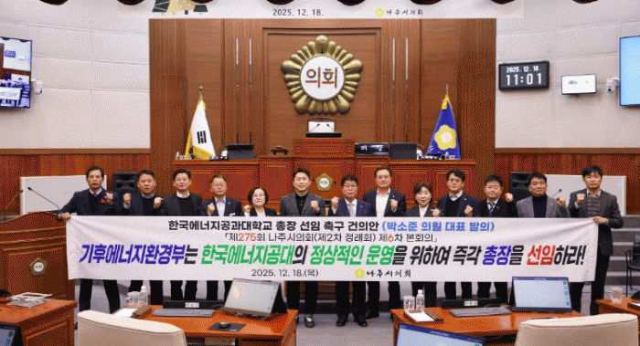 ³ªÁÖ½ÃÀÇȸ´Â À̹ø °ÇÀǾÈÀ» ÅëÇØ ±âÈÄ¿¡³ÊÁöȯ°æºÎ¿¡ ¡ãÇѱ¹¿¡³ÊÁö°ø°ú´ëÇб³ ÃÑÀå ¼±ÀÓ ÀýÂ÷¸¦ Áï°¢ Àç°³Çϰí Á¶¼ÓÈ÷ ÃÑÀå °ø¹é »çŸ¦ ÇØ¼ÒÇÒ °Í ¡ãÇѱ¹¿¡³ÊÁö°ø°ú´ëÇб³°¡ ¼³¸³ ¸ñÀû¿¡ ¸Â°Ô ¾ÈÁ¤ÀûÀ¸·Î ¿î¿µµÇ°í ±¹°¡ ¿¡³ÊÁö ÇÙ½É ÀÎÀç ¾ç¼ºÀÇ Á᫐ ¿ªÇÒÀ» ¼öÇàÇÒ ¼ö ÀÖµµ·Ï Àû±ØÀûÀÎ ÇàÁ¤Àû¡¤ÀçÁ¤Àû Áö¿øÀ» ÀÌÇàÇÒ °ÍÀ» Ã˱¸Çß´Ù.