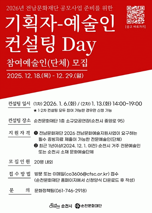 ¼øÃµ¹®ÈÀç´Ü °ü°èÀÚ´Â ¡°ÄÁ¼³ÆÃ Day´Â ¼øÃµ Áö¿ª¿¹¼úÀÎÀÌ °ø¸ð»ç¾÷À» º¸´Ù ü°èÀûÀ¸·Î ÁغñÇÒ ¼ö ÀÖµµ·Ï ½ÇÁúÀûÀÎ µµ¿òÀ» Á¦°øÇϱâ À§ÇØ ¸¶·ÃµÈ ÇÁ·Î±×·¥¡±À̶ó¸ç ¡°Àü³²¹®ÈÀç´Ü 2026 Àü³²¹®È¿¹¼úÁö¿ø»ç¾÷¿¡ Âü¿©¸¦ Èñ¸ÁÇÏ´Â ¿¹¼úÀεéÀÇ ¸¹Àº °ü½É°ú Âü¿©¸¦ ¹Ù¶õ´Ù¡±°í ¸»Çß´Ù.