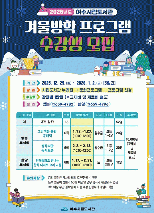 ¿©¼ö½Ã °ü°èÀÚ´Â ¡°°Ü¿ï¹æÇÐÀ» ¸Â¾Æ ÃʵîÇлýµéÀÌ µµ¼°üÀ» ÅëÇØ µ¶¼¿Í ¹®È Ȱµ¿À» Á¢ÇÒ ¼ö ÀÖµµ·Ï ÇÁ·Î±×·¥À» ¸¶·ÃÇß´Ù¡±¸ç ¡°½Ã¹ÎµéÀÇ ¸¹Àº °ü½É°ú Âü¿©¸¦ ¹Ù¶õ´Ù¡±°í ¹àÇû´Ù.