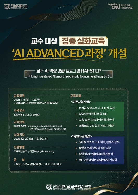 Á¤Àº°æ ±³À°Çõ½Åº»ºÎÀåÀº ¡°À̹ø AI ADVANCED °úÁ¤Àº ±³¼öµéÀÇ AI Ȱ¿ë ¿ª·®À» ÇÑ ´Ü°è ²ø¾î¿Ã·Á ¼ö¾÷°ú ¿¬±¸ Àü¹Ý¿¡ ½ÇÁúÀûÀÎ º¯È¿Í Çõ½ÅÀ» °¡Á®¿Ã °Í¡±À̶ó¸ç ¡°Àü³²´ëÇб³ÀÇ ±³¼ö AI ¿ª·® °È ¸ðµ¨ÀÌ °ÅÁ¡±¹¸³´ëÀÇ ¼±µµÀûÀΠǥÁØÀ¸·Î ÀÚ¸®¸Å±èÇÒ °ÍÀ¸·Î ±â´ëÇÑ´Ù¡±°í ¸»Çß´Ù.