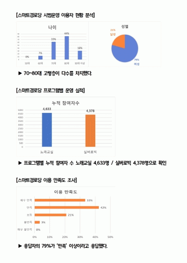 ÀÌ¿ëÀÚ ¼³¹®Á¶»ç °á°ú¿¡¼µµ ±àÁ¤ÀûÀÎ ¹ÝÀÀÀÌ À̾îÁ³´Ù. ÀÀ´äÀÚÀÇ 96%°¡ »ç¾÷ ¿î¿µ¿¡ ´ëÇØ ±àÁ¤Àû(¸¸Á· ÀÌ»ó 75%, º¸Åë 21%)À̶ó°í ´äÇßÀ¸¸ç, 79%´Â ÀÌÈÄ¿¡µµ °è¼Ó ÀÌ¿ëÇϰڴٴ Àǻ縦 ¹àÇû´Ù. À̸¦ ÅëÇØ »ç¾÷ÀÇ Áö¼Ó Çʿ伺ÀÌ È®Àεưí, Âü¿©ÀÚ ´ëºÎºÐÀÌ 70~80´ë °í·ÉÃþÀ¸·Î ½º¸¶Æ®°æ·Î´çÀÌ µðÁöÅÐ Ãë¾à°èÃþÀ» ´ë»óÀ¸·Î È¿°úÀûÀ¸·Î ¿î¿µµÈ °ÍÀ¸·Î ºÐ¼®µÆ´Ù.