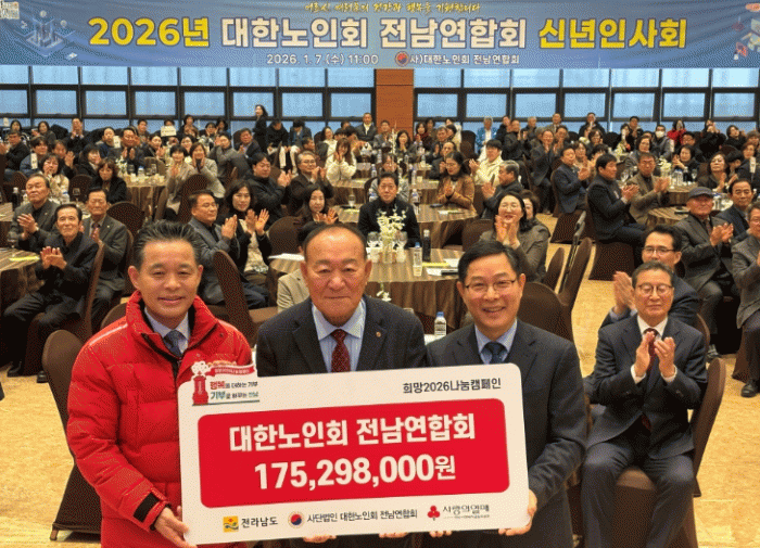 7ÀÏ ¹«¾È ½ºÄ«ÀÌ¿þµùÄÁº¥¼Ç¿¡¼ ¿¸° 2026³â ´ëÇѳëÀÎȸ Àü³²¿¬ÇÕȸ ½Å³âÀλçȸ¿¡¼ ÁøÇàµÈ ±âŹ½Ä¿¡´Â Á¤±¤¼± Àü³²µµ º¸°Çº¹Áö±¹Àå, ±èµ¿±Ø Àü³²»çȸº¹Áö°øµ¿¸ð±Ýȸ »ç¹«Ã³Àå, Á¤¾ç¼ö ´ëÇѳëÀÎȸ Àü³²¿¬ÇÕȸÀåÀ» ºñ·ÔÇÑ 22°³ ½Ã±º ÁöȸÀå µî 200¿© ¸íÀÌ Âü¼®Çß´Ù.