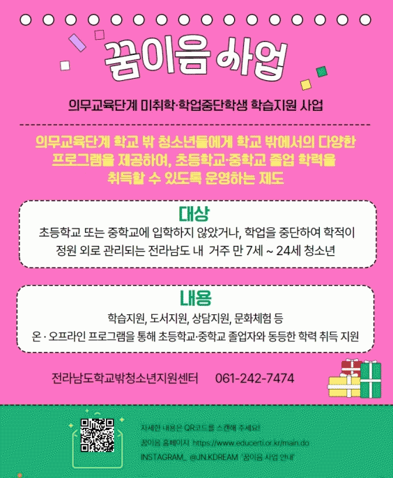 ¡®²ÞÀÌÀ½¡¯ »ç¾÷Àº Àǹ«±³À°´Ü°è Çб³ ¹Û û¼Ò³âÀ» ´ë»óÀ¸·Î ÇнÀÁö¿ø ÇÁ·Î±×·¥°ú ¿Â¶óÀÎ ±³À°°úÁ¤, Çб³ ¹Û ÇнÀ°æÇè µîÀ» Á¦°øÇÏ¿© ÇнÀ Áö¼ÓÀ» µµ¸ðÇÏ´Â µ¥ ¸ñÀûÀÌ ÀÖ´Ù. ¹è¿òÀÇ ±âȸ¸¦ ´Ù½Ã ¿¬°áÇϰí û¼Ò³âÀÇ ²ÞÀ» À̾´Ù´Â Àǹ̸¦ ´ã¾Æ ¡®²ÞÀÌÀ½¡¯À̶ó´Â À̸§À¸·Î ¿î¿µµÇ°í ÀÖ´Ù.