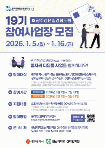 »ç¾÷¿¡ ¼±Á¤µÈ ¡®Á¦19±â µå¸²ÅÍ¡¯´Â ¿À´Â 3¿ùºÎÅÍ 7¿ù±îÁö ÃÖ´ë 5°³¿ù µ¿¾È û³â¿¡°Ô ÀϰæÇè ±âȸ¸¦ Á¦°øÇϸç, ÀÌ ±â°£ ±¤Áֽô Âü¿©Ã»³â ÀΰǺñÀÇ 90%¸¦ Áö¿øÇÑ´Ù.