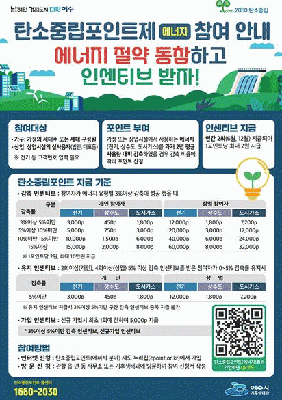 Áö³ÇØ ¿©¼ö½Ã¿¡¼´Â ÃÑ 1¸¸ 6,543°¡±¸°¡ ź¼ÒÁ߸³Æ÷ÀÎÆ®Á¦¿¡ Âü¿©ÇØ ¾à 2¾ï 6õ7¹é¸¸ ¿øÀÇ Àμ¾Æ¼ºê¸¦ Áö±Þ¹Þ¾ÒÀ¸¸ç 3,710tCO2eq(ÀÌ»êÈź¼Òȯ»êÅæ)ÀÇ ÀÌ»êÈź¼Ò¸¦ °¨ÃàÇÏ´Â ¼º°ú¸¦ °Åµ×´Ù.