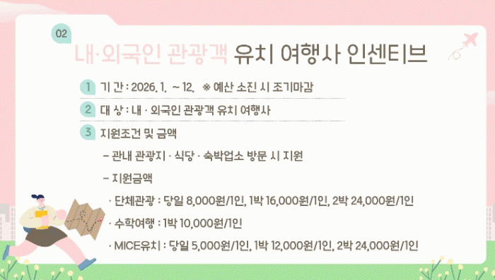 À̹ø Áö¿ø »ç¾÷Àº ±¤¾çÀ» ¹æ¹®ÇÏ´Â ´Üü °ü±¤°´À» ´ë»óÀ¸·Î °ü±¤Áö, ½Ä´ç, ¼÷¹Ú¾÷¼Ò µîÀ» ÀÌ¿ëÇÒ °æ¿ì ¿©Çà»ç¿¡ Àμ¾Æ¼ºê¸¦ Á¦°øÇÏ´Â ¹æ½ÄÀ¸·Î, ³»¡¤¿Ü±¹ÀÎ °ü±¤°´Àº ¹°·Ð ¼öÇп©Çà´Ü°ú MICE Çà»ç Âü°¡ÀÚ±îÁö Æø³Ð°Ô Áö¿øÇÑ´Ù.