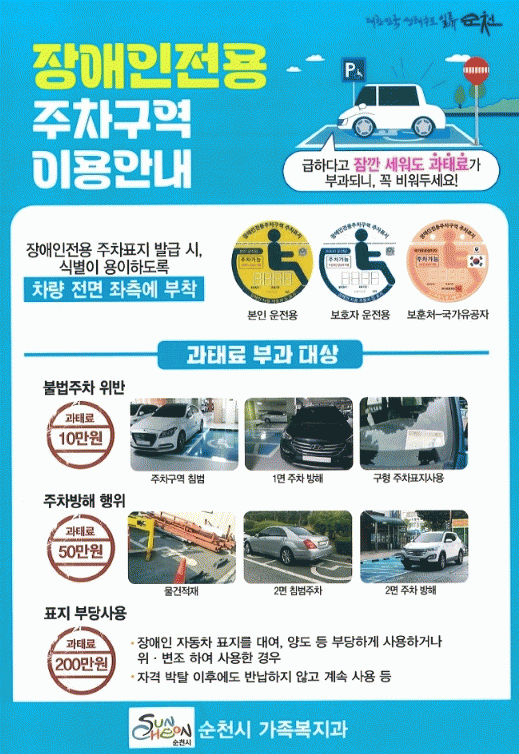 Àå¾ÖÀÎÀü¿ëÁÖÂ÷±¸¿ªÀº ¡®ÁÖÂ÷°¡´É¡¯ Ç¥Áö¸¦ ºÎÂøÇÑ Â÷·®À̶ó ÇÏ´õ¶óµµ º¸Çà»ó Àå¾ÖÀÎÀÌ ½ÇÁ¦ ž½ÂÇÑ °æ¿ì¿¡¸¸ ÀÌ¿ëÇÒ ¼ö ÀÖ´Ù.