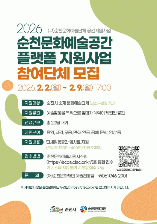 Áö¿ø ´ë»óÀº ¼øÃµ½Ã¿¡¼ Ȱµ¿ ÁßÀÎ ¹®È¿¹¼ú´Üü(ÃÖ¼Ò±¸¼º¿ø 7ÀÎ)·Î, ´Üü°¡ ¿î¿µÇϰųª »ç¿ëÇÏ´Â °ø°£À» Áß½ÉÀ¸·Î ¿¬½À¡¤¿¬±¸¡¤¹ßÇ¥¡¤±³·ù¡¤½Ã¹Î Âü¿© µî ´Ù¾çÇÑ ¿¹¼ú Ȱµ¿À» ¿î¿µÇϰíÀÚ ÇÏ´Â ´Üü¶ó¸é ½ÅûÇÒ ¼ö ÀÖ´Ù.