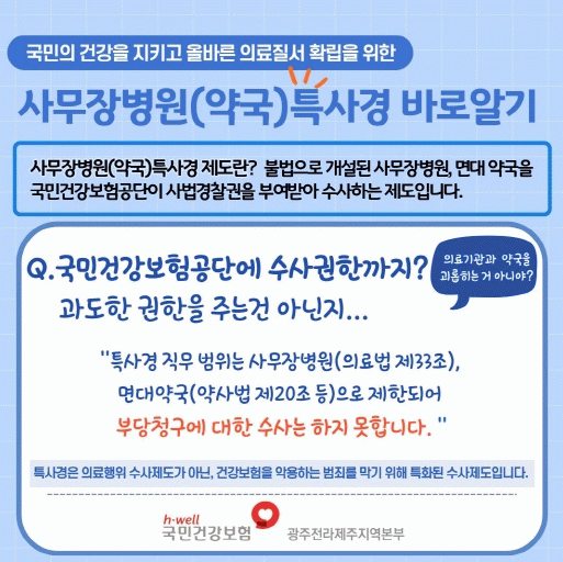 ±¹¹Î°Ç°º¸Çè°ø´Ü ±¤ÁÖÀü¶óÁ¦ÁÖÁö¿ªº»ºÎ´Â °ø´ÜÀÌ µµÀÔÇÏ´Â »ç¹«À庴¿ø(¾à±¹)Ư»ç°æ Á¦µµ¿¡ ´ëÇÑ ±¹¹ÎµéÀÇ ±Ã±ÝÁõÀ» ¾Ë±â ½±°Ô ¼³¸íÇÑ Ä«µå´º½º 5Á¾À» Á¦ÀÛÇÏ¿© ÃÑ 5ÁÖ¿¡ °ÅÃÄ °Ô½ÃµÇ°í ÀÖ´Ù.