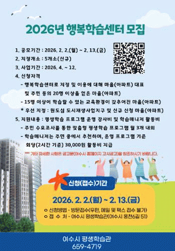 ½Åû ´ë»óÀº ÇູÇнÀ¼¾ÅÍ ÁöÁ¤¡¤À̿뿡 ´ëÇØ ¸¶À»(¾ÆÆÄÆ®) ´ëÇ¥¿Í ÁֹΠ20¸í ÀÌ»ó µ¿ÀǸ¦ ¾òÀº ¸¶À»(¾ÆÆÄÆ®)·Î 15¸í ÀÌ»óÀÌ µ¿½Ã¿¡ ÇнÀÇÒ ¼ö ÀÖ´Â ±³À°È¯°æÀ» °®Ãç¾ß ÇÑ´Ù.