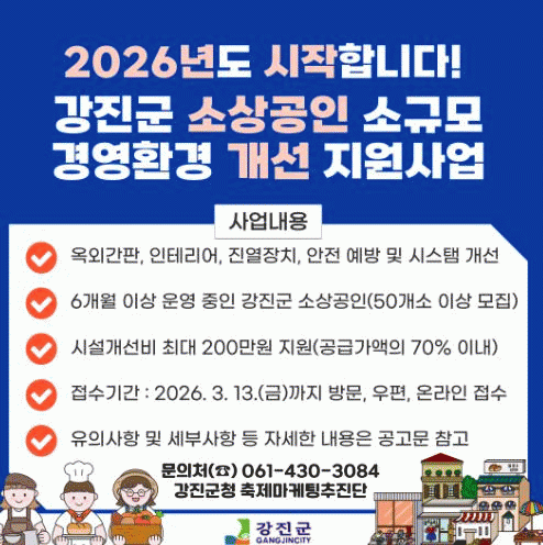 Áö¿ø ´ë»óÀº °Áø±º¿¡ »ç¾÷ÀÚµî·Ï°ú »ç¾÷Àå ÁÖ¼Ò¸¦ µÎ°í °ø°íÀÏ ±âÁØ 6°³¿ù ÀÌ»ó ¿µ¾÷ ÁßÀÎ ¼Ò»ó°øÀÎÀÌ´Ù.