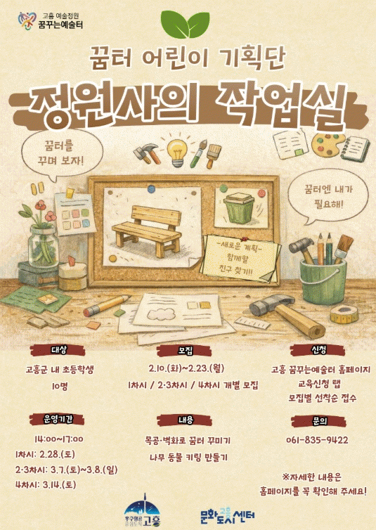 'Á¤¿ø»çÀÇ ÀÛ¾÷½Ç'Àº °íÈï ¿¹¼úÁ¤¿ø ²Þ²Ù´Â¿¹¼úÅÍÀÇ ÁÖ¿ä ÀÌ¿ëÀÚÀÎ ÃʵîÇлýµéÀÌ ¿¹¼úÁ¤¿øÀ» °¡²Ù´Â ¡®Á¤¿ø»ç¡¯°¡ µÇ¾î ¸ñ°ø°ú ¹Ì¼ú Ȱµ¿À» ÅëÇØ °ø°£À» Á÷Á¢ °³¼±ÇØ ³ª°¡´Â Âü¿©Çü ¹®È¿¹¼ú±³À° ÇÁ·Î±×·¥ÀÌ´Ù.