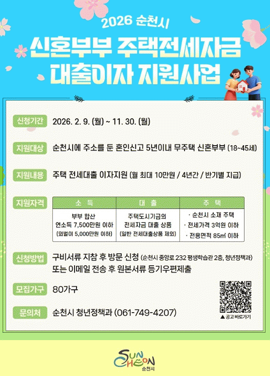 ½ÅÈ¥ºÎºÎ ÁÖÅÃÀü¼¼ÀÚ±Ý ´ëÃâÀÌÀÚ Áö¿ø»ç¾÷Àº ¼øÃµ½Ã¿¡ °ÅÁÖÇÏ´Â ¹«ÁÖÅà ½ÅÈ¥ºÎºÎ¿¡°Ô Àü¼¼ÀÚ±Ý ´ëÃâÀÌÀÚ¸¦ ¿ù 10¸¸ ¿ø¾¿ ÃÖ´ë 4³â°£ Áö¿øÇÏ´Â »ç¾÷ÀÌ´Ù.
