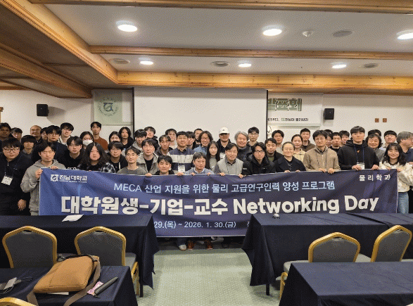 12ÀÏ Àü³²´ë¿¡ µû¸£¸é, Àü³²´ëÇб³ ¹°¸®Çаú´Â ¡®RISE»ç¾÷¡¯ÀÇ ÀÏȯÀ¸·Î Áö³ 1¿ù 29ÀϺÎÅÍ 30ÀϱîÁö 1¹Ú 2Àϰ£ ¹«ÁÖ ´öÀ¯»ê¸®Á¶Æ®¿¡¼ MECA »ê¾÷ Áö¿øÀ» À§ÇÑ ¹°¸® °í±Þ¿¬±¸Àη ¾ç¼ºÀ» ¸ñÀûÀ¸·Î ¡®´ëÇпø»ý(½ÅÁø¿¬±¸Àη Æ÷ÇÔ)-±â¾÷ ÀçÁ÷ÀÚ(ÀÓ¡¤Á÷¿ø)-±³¼öÁø Á¤±â Networking Day¡¯¸¦ ¼ºÈ²¸®¿¡ °³ÃÖÇß´Ù.