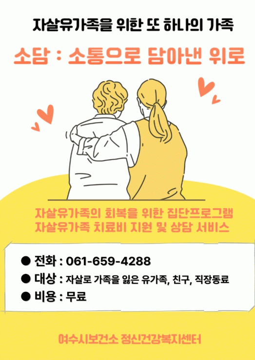 À̹ø ÀÚÁ¶¸ðÀÓÀº 3¿ùºÎÅÍ ¸Å¿ù 1ȸ ÀÌ»ó Á¤±âÀûÀ¸·Î ÁøÇàµÇ¸ç ÀÚ»ì·Î ÀÎÇÑ »ó½ÇÀ» °æÇèÇÑ À¯°¡Á·À» ´ë»óÀ¸·Î ¼·ÎÀÇ À̾߱⸦ ³ª´©°í Á¤¼Àû ÁöÁö¸¦ ¹ÞÀ» ¼ö ÀÖµµ·Ï ¸¶·ÃµÆ´Ù. Âü¿© ºñ¿ëÀº ¹«·áÀÌ´Ù.