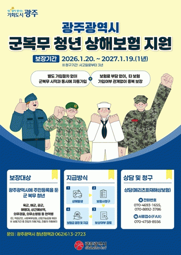 ±¤ÁÖ±¤¿ª½Ã´Â Áö³­ÇØ¿¡ ÀÌ¾î ¿ÃÇØ¿¡µµ ±¤ÁÖ Ã»³âµéÀÌ ±¹¹æÀǹ«¿¡ Àü³äÇÒ ¼ö ÀÖµµ·Ï ¡®±ºº¹¹« û³â »óÇØº¸Çè °¡ÀÔ¡¯À» Áö¿øÇÑ´Ù.
