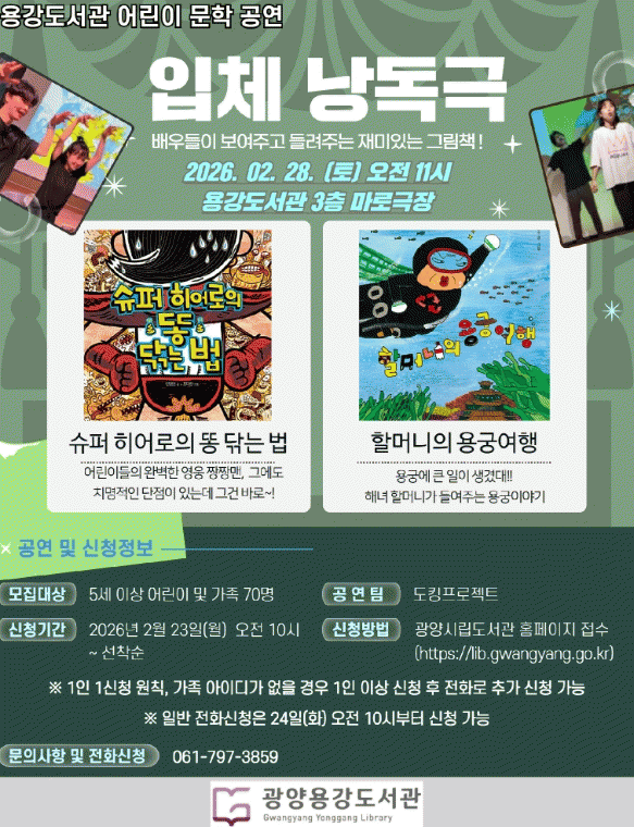 À̹ø °ø¿¬Àº ´ëÇзΠ¿¬±Ø¹è¿ìµéÀÌ ÁÖÃàÀÌ µÇ¾î ¹®Çаú °ø¿¬¿¹¼ú Á¢¸ñÇØ ÀÔü³¶µ¶±ØÀ» ±âȹ¡¤Á¦ÀÛ¡¤°ø¿¬ÇÏ´Â ¡®µµÅ·ÇÁ·ÎÁ§Æ®¡¯°¡ ÁøÇàÇϸç, ¡ãÀÔü³¶µ¶±Ø ¼Ò°³ ¡ã'ÇÒ¸Ó´ÏÀÇ ¿ë±Ã ¿©Çà' ³¶µ¶±Ø ¡ã'½´ÆÛ È÷¾î·ÎÀÇ ¶Ë ´Û´Â ¹ý' ³¶µ¶±Ø ¡ã±â³äÃÔ¿µ ¼øÀ¸·Î ¿î¿µµÈ´Ù. °ü¶÷Àº ±¤¾ç½Ã ¾î¸°ÀÌ¿Í °¡Á· 70¸íÀ» ´ë»óÀ¸·Î ÁøÇàµÉ ¿¹Á¤ÀÌ´Ù.