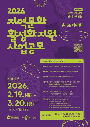 ³ªÁÖ¹®È­Àç´ÜÀº ¡®2026 Áö¿ª¹®È­ Ȱ¼ºÈ­ Áö¿ø»ç¾÷¡¯ °ø¸ð¸¦ ¿À´Â 3¿ù 20ÀÏ ¿ÀÈÄ 4½Ã±îÁö ÁøÇàÇÑ´Ù°í 19ÀÏ ¹àÇû´Ù.