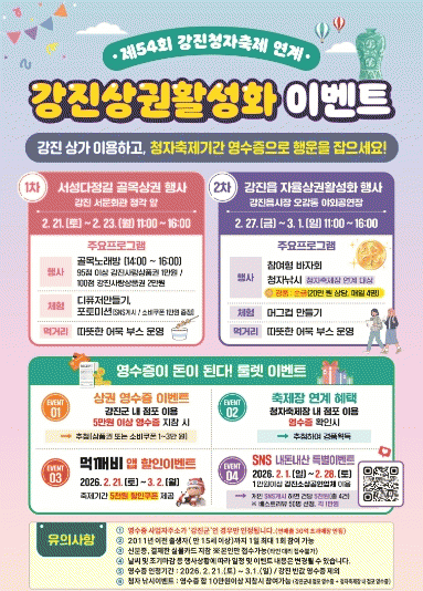 Çà»ç Âü¿©¸¦ À§ÇÑ À¯ÀÇ»çÇ×µµ ²Ä²ÄÈ÷ È®ÀÎÇØ¾ß ÇÑ´Ù. ¿µ¼öÁõÀº »ç¾÷ÀÚ ÁÖ¼Ò°¡ ¡®°Áø±º¡¯À¸·Î Ç¥±âµÈ Á¡Æ÷ÀÇ °Í¸¸ ÀÎÁ¤µÇ¸ç, ¿¬¸ÅÃâ 30¾ï ¿ø Ãʰú ¸ÅÀåÀº Á¦¿ÜµÈ´Ù. Âü¿© °¡´É ´ë»óÀº 2011³â ÀÌÀü Ãâ»ýÀÚ·Î 1ÀÏ ÃÖ´ë 1ȸ Âü¿©ÇÒ ¼ö ÀÖ´Ù. Á¢¼ö ½Ã¿¡´Â ¹Ýµå½Ã ½ÅºÐÁõ°ú °áÁ¦¿¡ »ç¿ëÇÑ ½Ç¹°Ä«µå¸¦ ÁöÂüÇØ¾ß Çϸç, º»Àθ¸ Á¢¼ö °¡´ÉÇÏ´Ù. ³¯¾¾³ª ÇöÀå »óȲ¿¡ µû¶ó ÀÏÁ¤°ú ÀϺΠÀ̺¥Æ® ³»¿ëÀº º¯°æµÉ ¼ö ÀÖ´Ù. ¿µ¼öÁõ ÀÎÁ¤ ±â°£Àº 2¿ù 21ÀϺÎÅÍ 3¿ù 1ÀϱîÁöÀ̸ç, °Áø ¹Ý°ª ¿µ¼öÁõÀº Á¦¿ÜµÈ´Ù.
