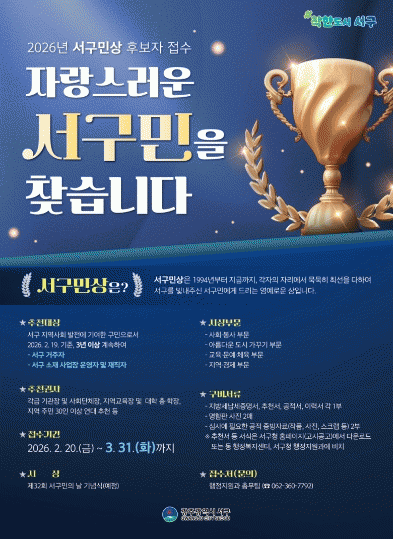 Èĺ¸ÀÚ Ãßõ ±âÇÑÀº 3¿ù31ÀϱîÁöÀ̸ç Ãßõ¼­, °øÀûÁ¶¼­ µî °ü·Ã ¼­·ù¸¦ ÁغñÇØ ¼­±¸Ã» ÇàÁ¤Áö¿ø°ú(062-360-7792)·Î Á¦ÃâÇÏ¸é µÈ´Ù. ½Ã»ó½ÄÀº ¡®Á¦32ȸ ¼­±¸¹ÎÀÇ ³¯¡¯ ±â³äÇà»ç¿¡¼­ ÁøÇàµÉ ¿¹Á¤ÀÌ´Ù.