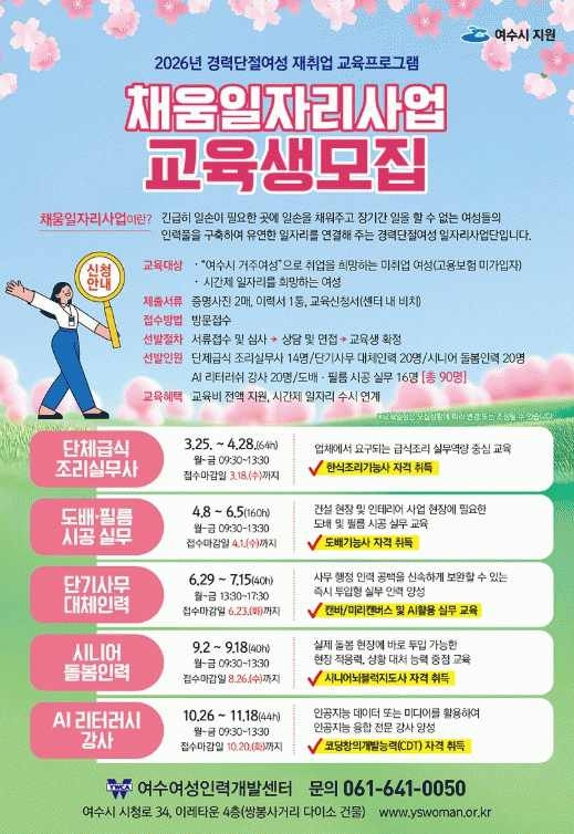 2026³â ÀçÃë¾÷±³À°ÇÁ·Î±×·¥Àº ±³À°°úÁ¤°ú ½Ç½ÀÀ¸·Î ¿©¼ºÀÎÀ縦 ¾ç¼ºÇÏ°í ±ä±Þ Àη ¼ö¿ä¿¡ ´ëÀÀÇÒ ÀηÂÇ®À» ±¸ÃàÇØ À¯¿¬ÇÑ ÀÏÀÚ¸®¿Í ¿¬°èÇÏ´Â ÀÚ°ÝÃëµæ¡¤½Ç¹«Á᫐ °úÁ¤ÀÌ´Ù.
