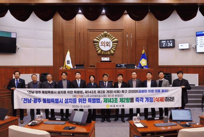 ³ªÁÖ½ÃÀÇȸ´Â 3¿ù 6ÀÏ Á¦278ȸ ÀÓ½Ãȸ Á¦1Â÷ º»È¸ÀǸ¦ ¿­°í ''Àü³²±¤ÁÖÅëÇÕÆ¯º°½Ã ¼³Ä¡¸¦ À§ÇÑ Æ¯º°¹ý' Á¦143Á¶ Á¦2Ç× »èÁ¦ Ã˱¸ °ÇÀǾÈ'À» äÅÃÇß´Ù.