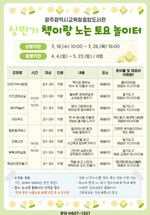 ¿ÀÀü °úÁ¤Àº ¡ãÀ̾߱⿪»çŽÇè(3~6Çгâ) ¡ãŰÁî°æÁ¦±³½Ç(3~6Çгâ) ¡ã¿µ¾îÃ¥³îÀÌ(1~4Çгâ) ¡ã¸®µùǪµå(¸ðµç Çгâ) µî 4°³, ¿ÀÈÄ °úÁ¤Àº ¡ãÁöÇý°íÀü(3~6Çгâ) ¡ãÈú¸µÇʶóÅ×½º(¸ðµç Çгâ) ¡ãºÏÅå°úÇнÇÇè(¸ðµç Çгâ) ¡ãºÏ¸ðƼÄܸ¸µé±â(¸ðµç Çгâ) µî 4°³·Î ±¸¼ºµÆ´Ù.