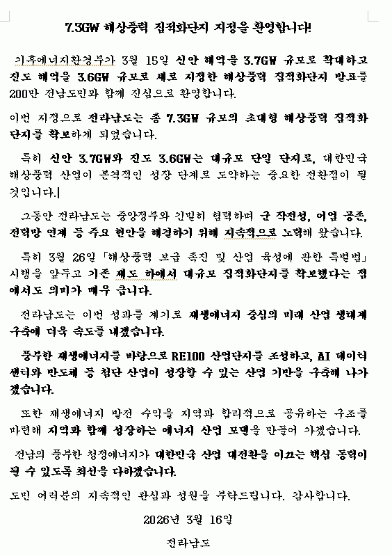 À̹ø °áÁ¤À¸·Î Áøµµ ÇØ¿ª 2°³ ´ÜÁö(3.6GW)°¡ ½Å±Ô ÁöÁ¤µÇ°í, ½Å¾È ÇØ¿ªÀÌ 3.7GW ±Ô¸ð·Î È®´ëµÇ¸é¼ Àü³²Àº ÃÑ 7.3GW ±Ô¸ðÀÇ ÃÊ´ëÇü ÇØ»ódz·Â ÁýÀûÈ´ÜÁö¸¦ È®º¸ÇÏ°Ô µÆ´Ù.