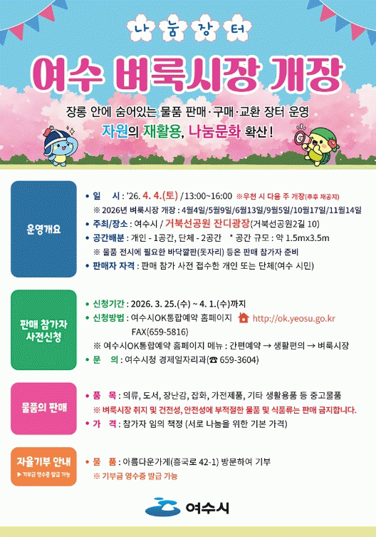 ¿©¼ö º·è½ÃÀåÀº Ȥ¼±âÀÎ 7¡¤8¿ùÀ» Á¦¿ÜÇϰí 11¿ù±îÁö ÃÑ 6ȸ ¿î¿µµÇ¸ç 4¿ù 4ÀÏÀ» ½ÃÀÛÀ¸·Î 5¿ù 9ÀÏ, 6¿ù 13ÀÏ, 9¿ù 5ÀÏ, 10¿ù 17ÀÏ, 11¿ù 14ÀÏ¿¡ °³ÀåÇÒ ¿¹Á¤ÀÌ´Ù.