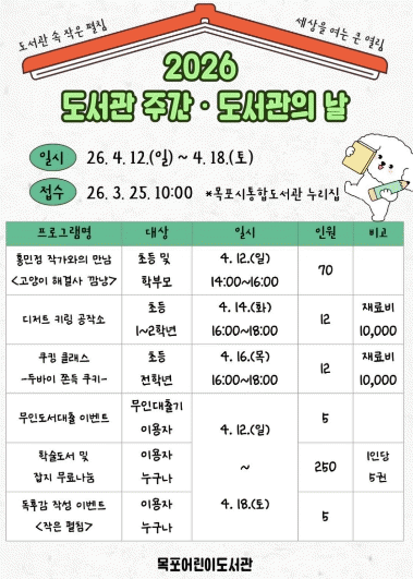 ¸ñÆ÷¾î¸°À̵µ¼­°üÀº 2026³â µµ¼­°üÀÇ ³¯ ¹× µµ¼­°ü ÁÖ°£À» ¸Â¾Æ Áö¿ª ÁÖ¹ÎÀ» À§ÇÑ ´Ùä·Î¿î µ¶¼­¹®È­ ÇÁ·Î±×·¥À» ¿î¿µÇÑ´Ù.
