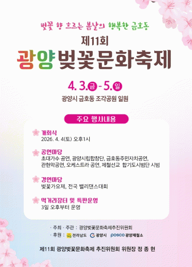 Á¤Á¾Çö ±¤¾çº¢²É¹®ÈÃàÁ¦ÃßÁøÀ§¿øÀåÀº ¡°Á¦11ȸ ±¤¾çº¢²É¹®ÈÃàÁ¦°¡ Áö¿ªÁÖ¹ÎÀº ¹°·Ð Àü±¹¿¡¼ ã¾Æ¿À´Â °ü±¤°´µé¿¡°Ô º½³¯ÀÇ ÇູÇÑ ±â¾ïÀ¸·Î ³²±æ ¹Ù¶õ´Ù¡±¸ç ¡°¾ÈÀüÇϰí ÄèÀûÇÑ ÃàÁ¦ ¿î¿µÀ» À§ÇØ Áغñ¿¡ ÃÖ¼±À» ´ÙÇϰڴ١±°í ¹àÇû´Ù.