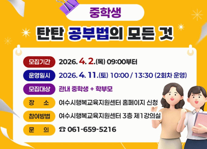 Âü¿©¸¦ Èñ¸ÁÇÏ´Â ÇлýÀº 4¿ù 2ÀÏ ¿ÀÀü 9½ÃºÎÅÍ ¿©¼ö½ÃÇູ±³À°Áö¿ø¼¾ÅÍ ´©¸®ÁýÀ» ÅëÇØ »çÀü ½Åû ÈÄ Âü¿©ÇÒ ¼ö ÀÖÀ¸¸ç, Âü¿©ÀÚ Àü¿ø¿¡°Ô °øºÎ¹ý °¡À̵å ÀÚ·á µîÀ» Á¦°øÇÑ´Ù.