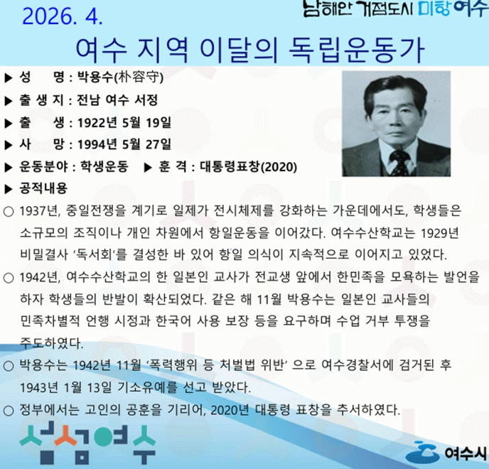 ÇÑÆí, ¿©¼ö½Ã´Â µ¶¸³¿îµ¿°¡ÀÇ ¿ª»çÀû °¡Ä¡¸¦ ÀçÁ¶¸íÇÏ°í µ¶¸³Á¤½ÅÀ» È®»êÇϱâ À§ÇØ 2022³â 8¿ùºÎÅÍ ¿©¼öÁö¿ªµ¶¸³¿îµ¿°¡À¯Á·È¸¿Í °øµ¿À¸·Î Áö¿ª Ãâ½Å µ¶¸³¿îµ¿°¡¸¦ ¼±Á¤ÇØ È«º¸Çϰí ÀÖÀ¸¸ç ÇöÀç±îÁö ¿©¼öÁö¿ª µ¶¸³¿îµ¿°¡ ÃÑ 85¸íÀ» Ãß¼Çß´Ù.