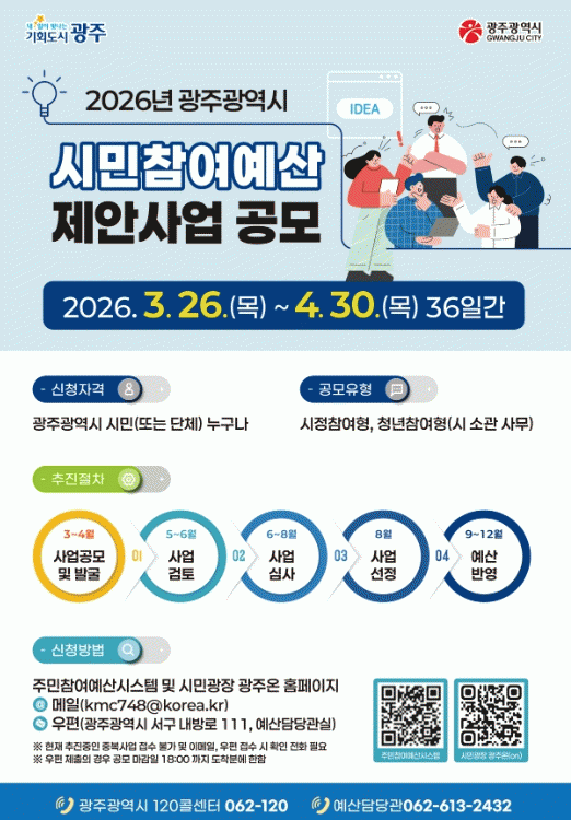 ±¤Áֽô Á¢¼öµÈ Á¦¾È»ç¾÷¿¡ ´ëÇØ ¼Ò°üºÎ¼ °ËÅä, ½Ã¹ÎÅõÇ¥, ½Ã¹ÎÂü¿©¿¹»êÀ§¿øÈ¸ÀÇ ½ÉÀÇ µîÀ» °ÅÃÄ 2027³â ¿¹»ê¾È¿¡ ¹Ý¿µÇÒ ¿¹Á¤ÀÌ´Ù. ÀÌÈÄ ±¤ÁÖ½ÃÀÇȸ ½ÂÀÎÀ» ¹ÞÀ¸¸é »ç¾÷ÀÌ ÃÖÁ¾ È®Á¤µÈ´Ù.