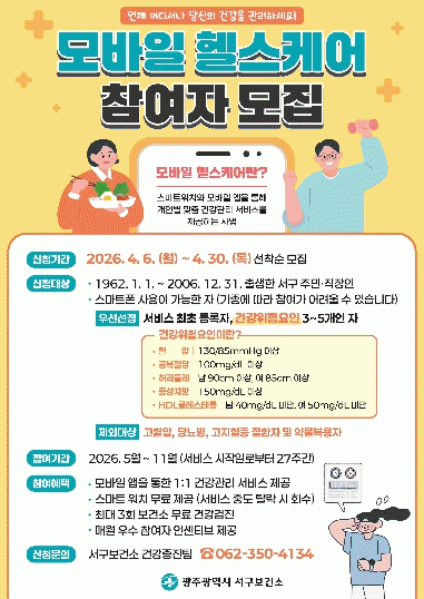 ±¤ÁÖ±¤¿ª½Ã ¼­±¸°¡ Áö¿ªÁÖ¹ÎÀÇ °Ç°­°ü¸® ¿ª·® °­È­¸¦ À§ÇØ Á¤º¸Åë½Å±â¼ú(ICT)À» Ȱ¿ëÇÑ °Ç°­°ü¸® ¼­ºñ½º ¡®¸ð¹ÙÀÏ ÇコÄɾ Âü¿©ÀÚ 125¸íÀ» ¿À´Â 30ÀϱîÁö ¼±Âø¼ø ¸ðÁýÇÑ´Ù.