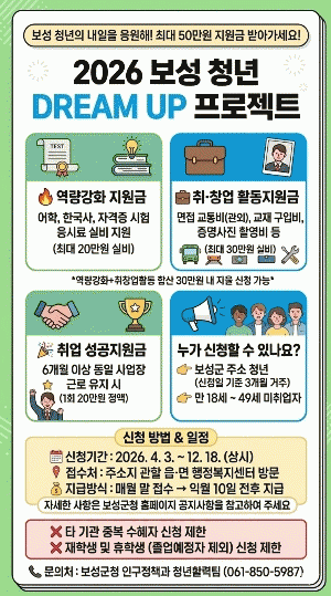 º¸¼º±ºÀº °íÇâ»ç¶û±âºÎÁ¦·Î Á¶¼ºµÈ ±â±Ý 6,000¸¸ ¿øÀ» Ȱ¿ëÇØ Áö¿ª û³âÀÇ Ãë¾÷¡¤Ã¢¾÷À» Áö¿øÇÏ´Â ¡®2026³â º¸¼º û³â DREAM UP ÇÁ·ÎÁ§Æ®¡¯¸¦ º»°Ý ÃßÁøÇÑ´Ù°í ¹àÇû´Ù.