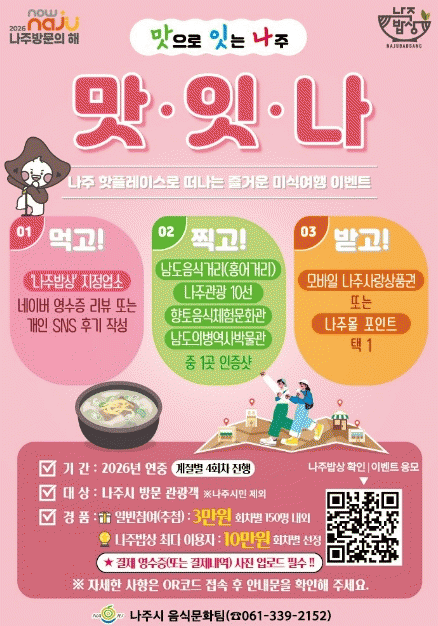 Âü¿© ¹æ¹ýÀº ³ªÁÖ¹ä»ó ÁöÁ¤¾÷¼Ò¿¡¼ ½Ä»ç ÈÄ ¸®ºä(³×À̹ö ¿µ¼öÁõ ¶Ç´Â SNS Èıâ)¸¦ ÀÛ¼ºÇÏ°í ³²µµÀ½½Ä°Å¸®(¿µ»êÆ÷ È«¾î°Å¸®), ³ªÁÖ °ü±¤ 10¼±, ÇâÅäÀ½½ÄüÇ蹮Ȱü, ³²µµÀǺ´¿ª»ç¹Ú¹°°ü Áß ÇÑ °÷À» ¹æ¹®ÇØ ÀÎÁõ»çÁøÀ» Âï¾î Àü¿ë ¸µÅ©¿¡ ¾÷·ÎµåÇÏ¸é µÈ´Ù.